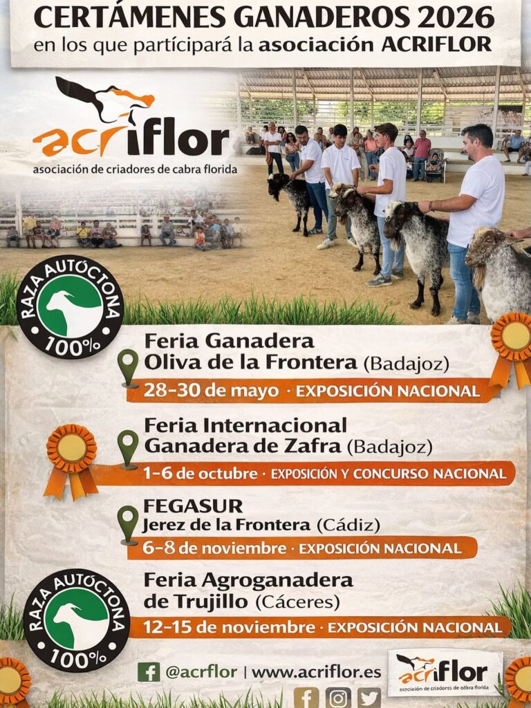Os mostramos el Calendario Oficial de Certámenes de Ganado Selecto de carácter nacional donde estará presente la Raza Caprina Florida en 2026 tras su aprobación reciente por parte del Ministerio de Agricultura, Pesca y Alimentación (MAPA), mediante la Resolución de la Dirección General de Producciones y Mercados Agrarios.